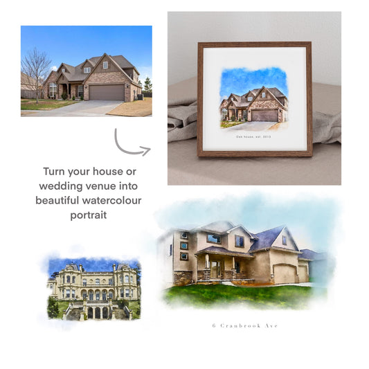 Custom house portrait in watercolour style, wedding venue portrait, or personalised building portrait